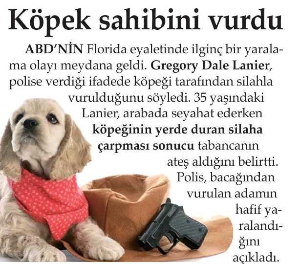 Köpek sahibini vurdu ABD’NİN  Florida eyaletinde ilginç bir yaralama olayı meydana geldi. Gregory Dale Lanier, polise verdiÄŸi ifadede köpeÄŸi tarafından silahla vurulduÄŸunu söyledi. 35 yaşındaki Lanier, arabada seyahat ederken köpeÄŸinin yerde duran silaha çarpması sonucu tabancanın ateÅŸ aldığım belirtti.